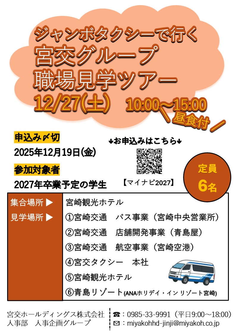 宮崎の観光・交通・ホテル業界を支える「宮交グループ」の仕事を、実際に見て・感じて・体験できる特別な見学ツアーです。